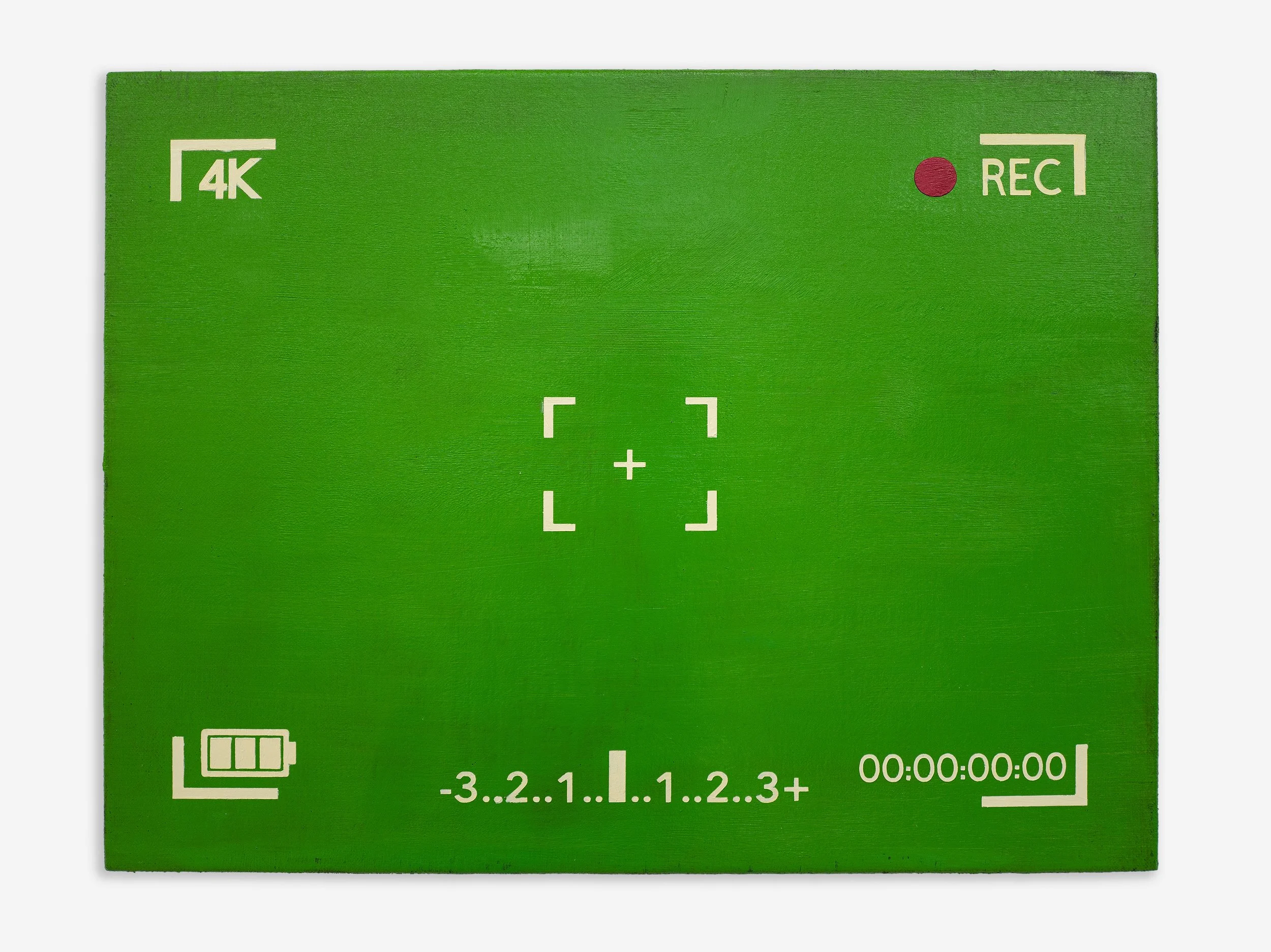 4K (2022) captures a camera screen frozen mid-recording, displaying a chroma-key (green screen) composition. The viewer is positioned within the camera’s perspective, collapsing the boundary between observer and participant. This interplay raises questions about the mediation of reality through technology—how images are processed, manipulated, and ultimately perceived. Chroma keying, a technique widely used in film and digital media, allows for the seamless replacement of backgrounds, making the green surface both hyper-visible and entirely erasable. The painting’s saturated green hue highlights its potential to disappear, emphasizing the paradox of visibility and invisibility in digital manipulation. Meanwhile, the 4K recording indicator reflects the pursuit of ultra-high-definition clarity. By suspending the moment between recording and recorded, 4K explores ideas of representation and authenticity in an era where media is increasingly constructed. The work invites the viewer to consider how technology shapes perception—whether we are simply looking at an image or becoming absorbed into its frame.