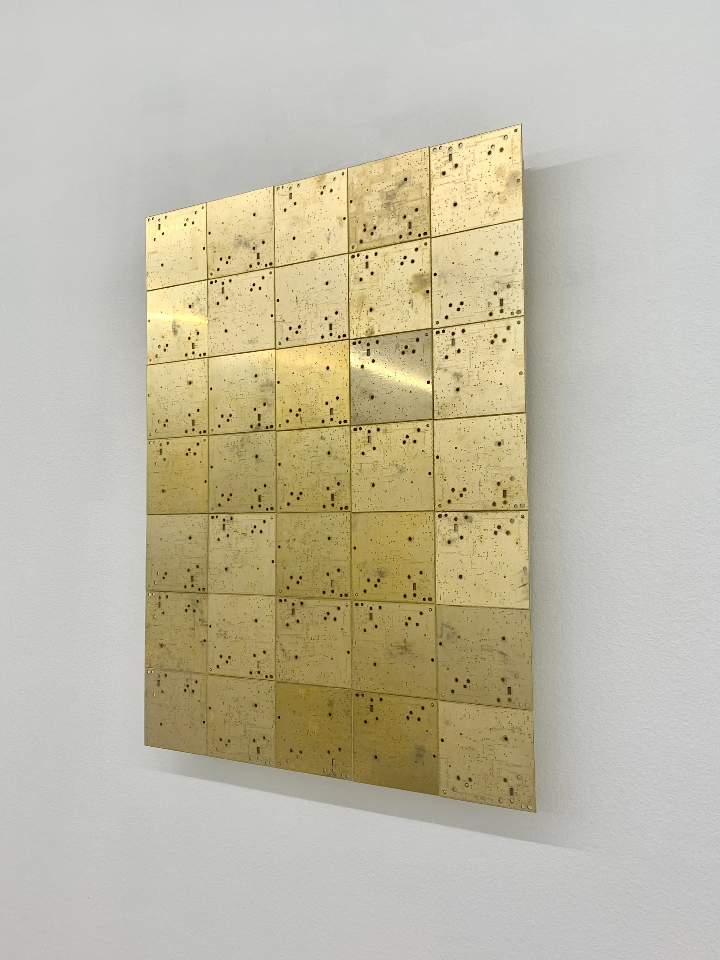 A circuit board serves as the architectural framework of a computer's functioning mind, operating on the core principle of manipulating on-and-off signals to execute logical operations. It mechanically supports and interconnects electronic components, facilitating the flow of these signals. Each hole and engraving etched onto a chip carries its own significance. In Mapping (2021), a collection of thirty-five found circuit boards is reimagined as an operational map spliced together. Arranged to evoke an astronomical pattern, the sculptural landscape mirrors a night sky filled with stars. By displacing the functional markings of the circuit boards, the engravings coalesce into random, abstract patterns. Through this assemblage, Mapping examines the functional essence of digitization while simultaneously creating a visual representation of the universe shaped by randomness and chance.