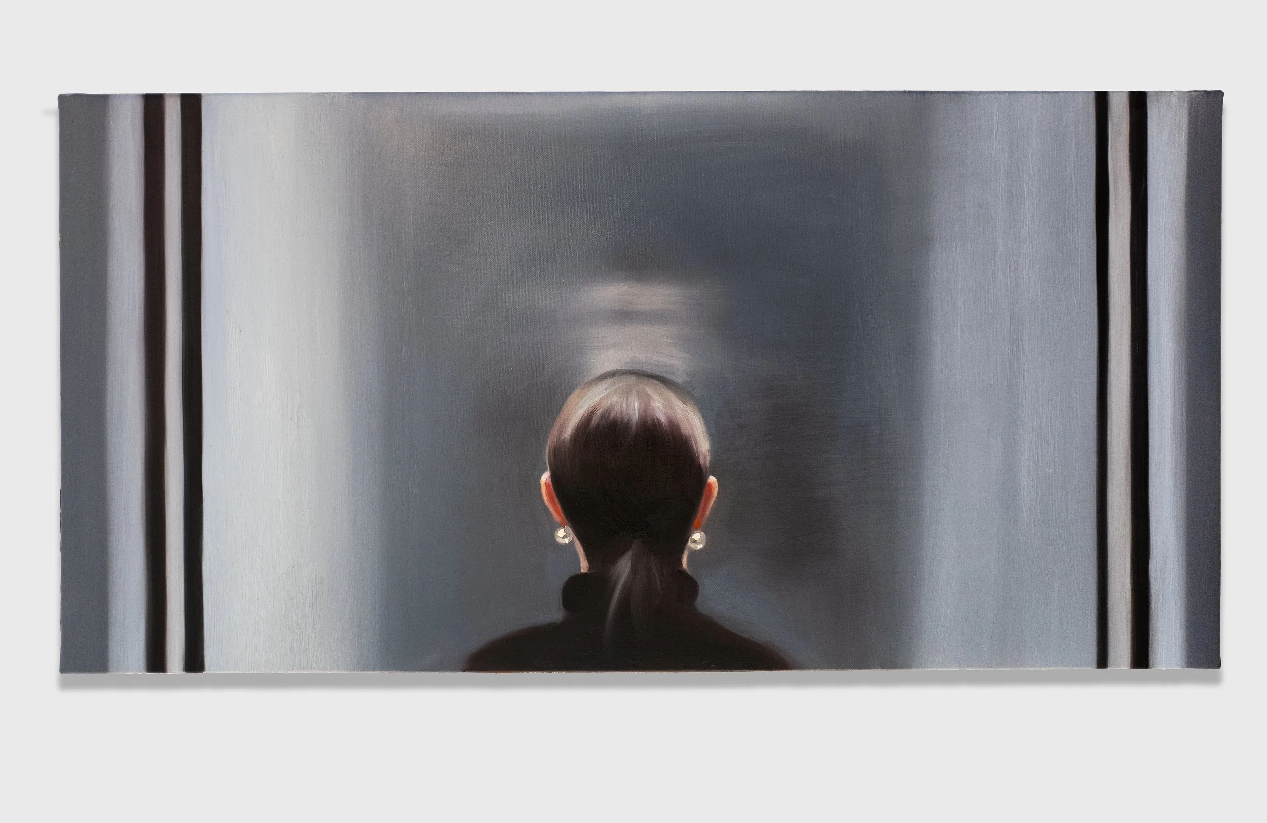 Tan Mu: If I had painted the figure facing the viewer, the painting would have become a conventional portrait and the relationship between person and machine would have been secondary. Turning her away places the viewer in the position of watching someone else's act of looking. You see what she sees, but you also see her seeing it. This creates a layered structure of observation that connects to the observer effect in quantum physics, where the act of measurement changes the system being measured. Here, looking itself becomes the subject. The pearl earrings were important to me. They are the only identifying detail, small points of warmth and light against the cool surface of the machine. They prevent the figure from becoming an abstraction. She is a specific person in a specific encounter, even though her identity remains withheld. I think of them the way a single remembered detail can hold an entire experience in place.