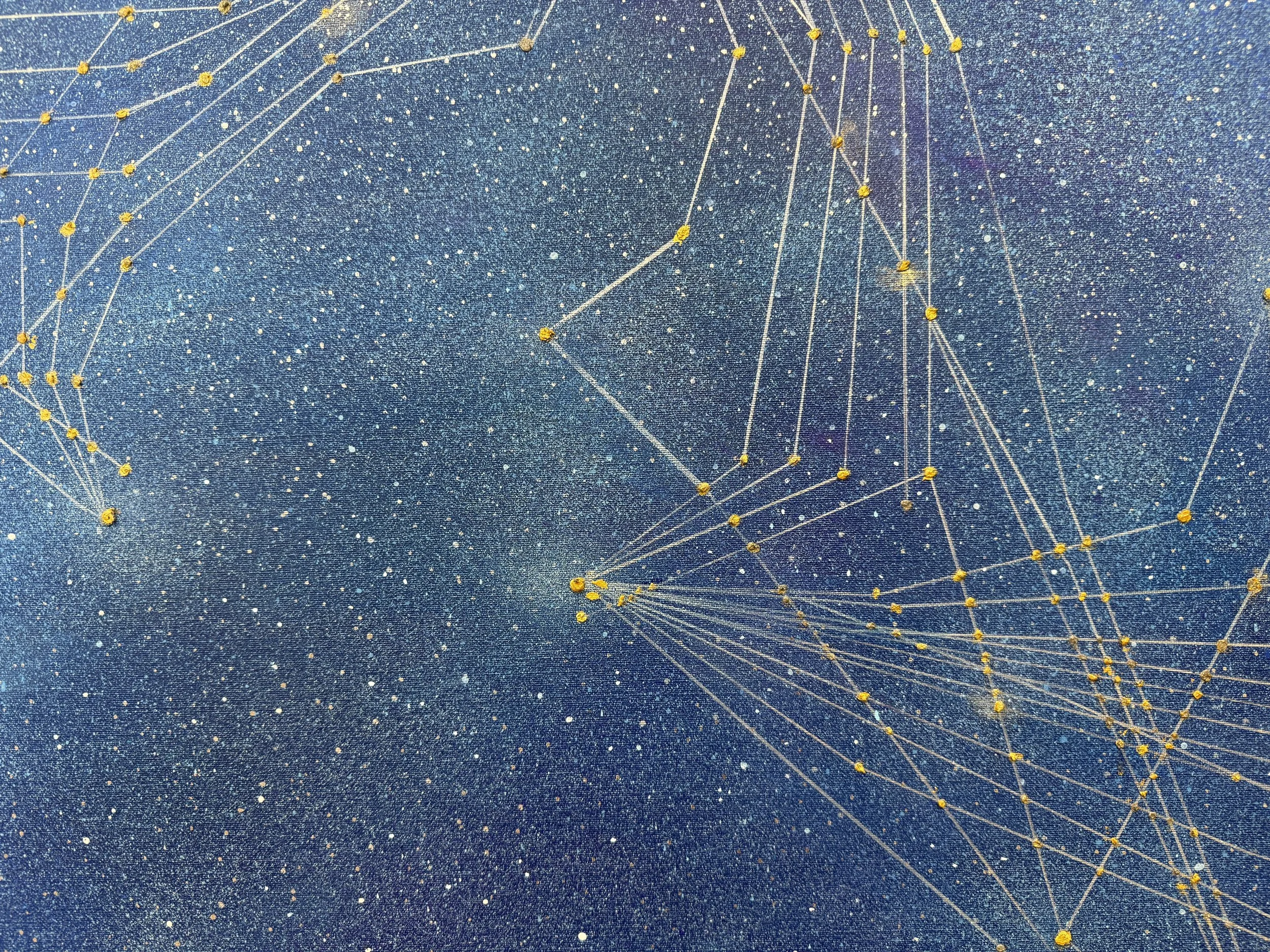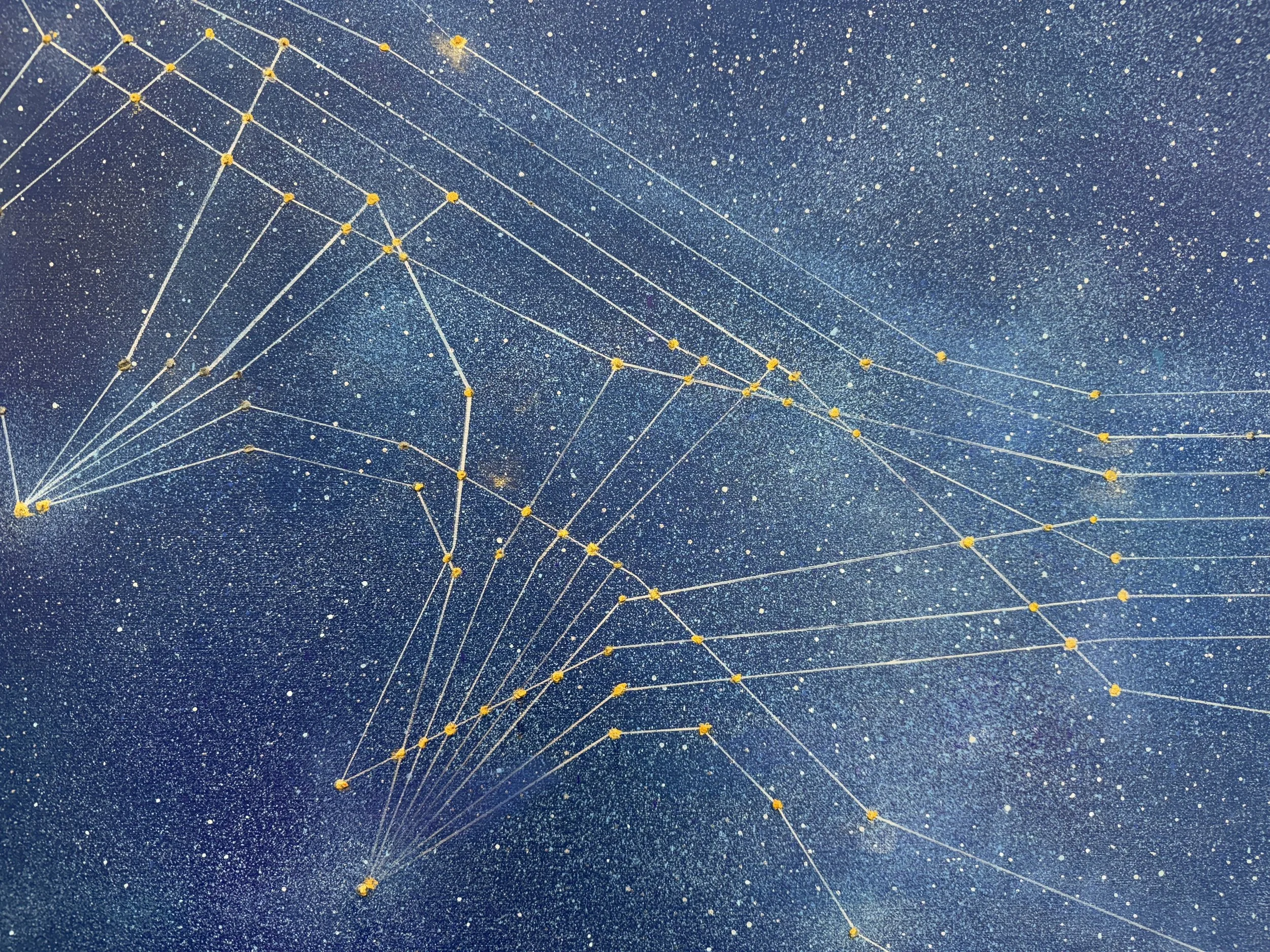 Tan Mu: The perspective of the composition comes from my diving experiences. Only when you dive into the ocean and look upwards do the sea and the starry sky intertwine. Here, the sky (starry sky), the earth (ocean), and humans (submarine cables) are connected on one plane. Through outlined points and lines, and layers of rendered blues with varying hues, the painting presents itself between abstraction and figuration, merging the poetic mythology of constellations with the tangible structures of global connectivity. The dots in the work have multiple meanings. On one hand, they represent data packets flowing through these cables—an abstract visualization of information transmitting across the ocean. On the other hand, they evoke a sense of "white noise" or pixelation, almost like visual static of data flow. These dots convey the randomness and structure within the flow of information, inviting viewers to reflect on how these countless fragments of data collectively build the ongoing stream of global communication. They also remind us of the hidden pulse of digital life—an invisible, endless rhythm that underpins our daily interactions. The arrangement of the dots simulates both constellations and the data flow in networks, metaphorically connecting the ocean and the sky, and symbolizing the interconnectedness of global collaboration. By juxtaposing the instantaneous transmission of data with the meticulously designed infrastructure, and the eternal tranquility of starlight with human collective labor, I transform these cold technological symbols into warm collective memories. When viewers gaze at these "digital constellations," they see not only an abstract representation of the information age but also stories of connection, woven into a narrative network that spans nature, technology, and human labor.