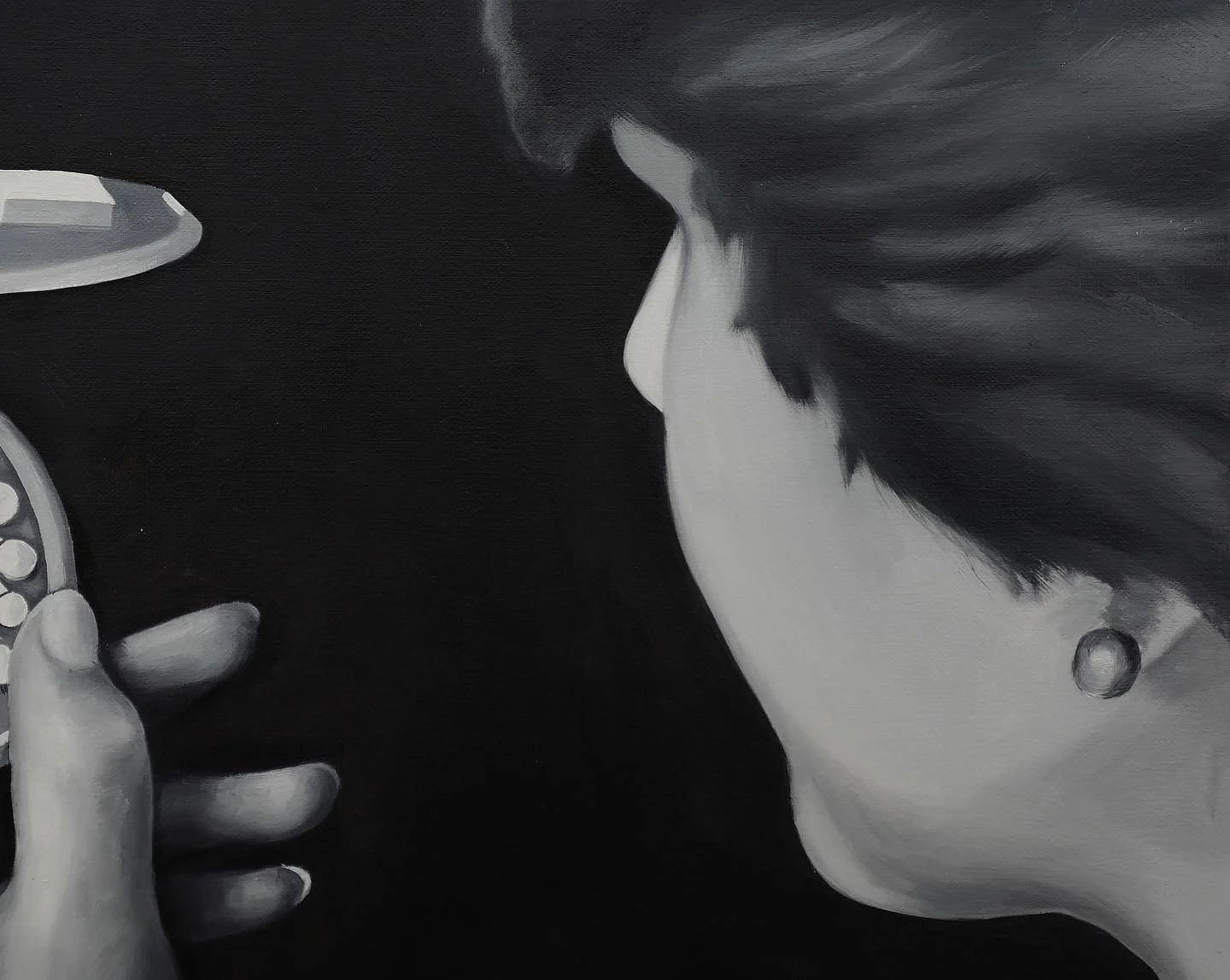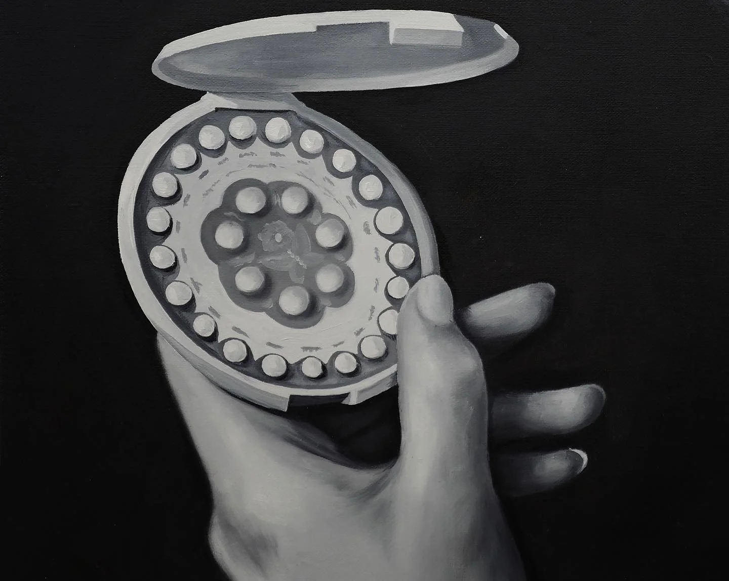 Q: Your work The Pill (2021) depicts early birth control pill advertisements. Could you talk about the background and inspiration behind this piece?